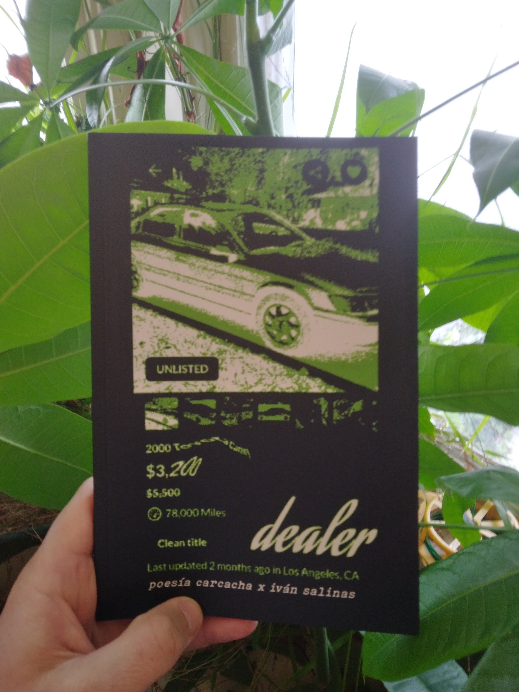 “Dealer is a hybrid poetry collection that maps the spiritual, mechanical, and political life of his car in late capitalism. Set in motion within Los Angeles freeways, border crossings, DMV lines, and daydream dreamscapes, the book cross-examines how brown surveilled bodies are allowed to move. Blending auto-repair diagnostics, Aztec cosmology, Catholic iconography, erotic fantasy, and glitch poetics, this work exposes driving as both necessity and resistance. To drive is to live. To stall is to disappear.”